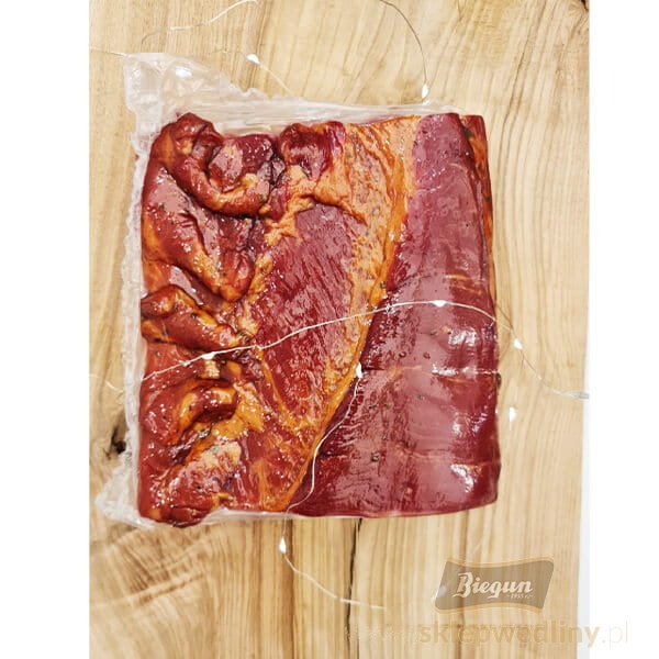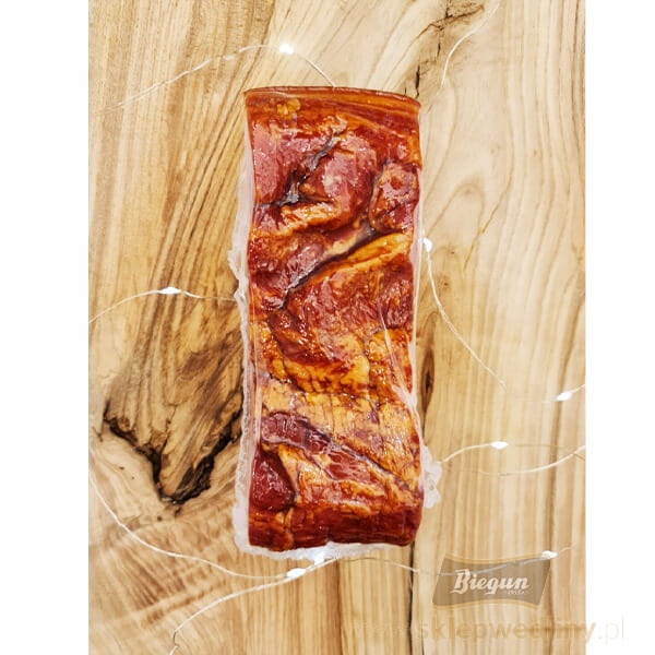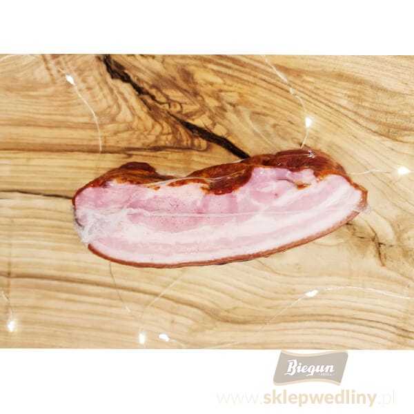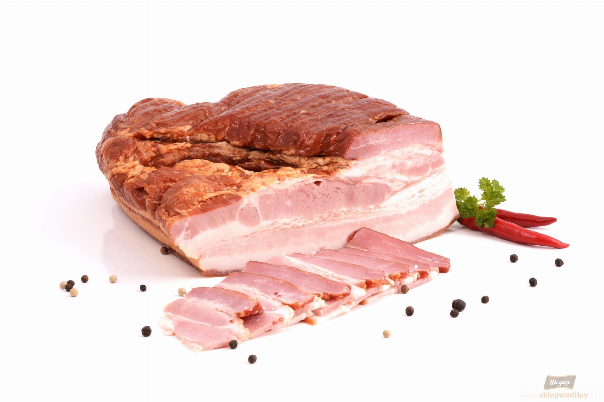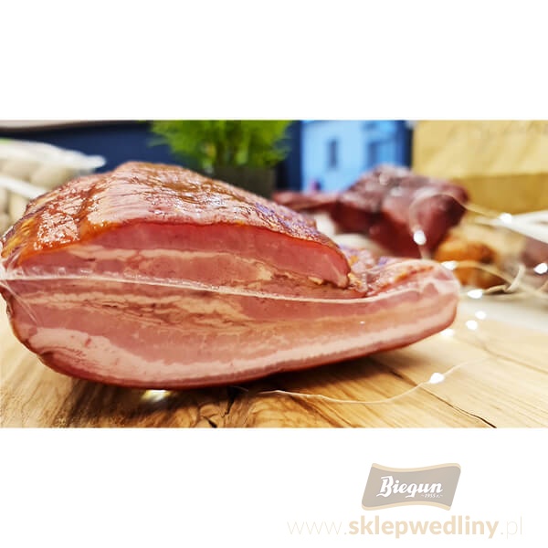 Boczek wędzony otrzymany z najwyższej jakości peklowanego boczku wieprzowego ze skórą. Znakomicie nadaje się do przygotowania tradycyjnego domowego bigosu. Idealnie pasuje jako dodatek do wielu potraw. Wyselekcjonowany boczek sprawia, że proporcja tłuszczyku i mięsa jest wręcz idealna.